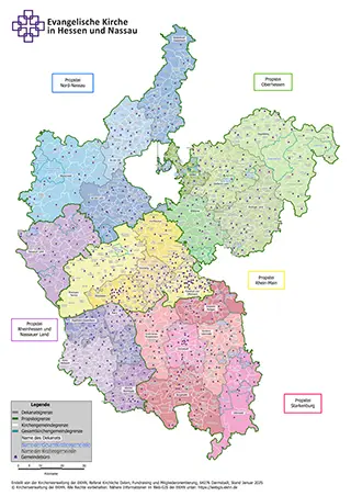 Die Übersicht über die EKHN gibt es in unterschiedlichen Darstellungsformaten (Stand 1.1.2025):