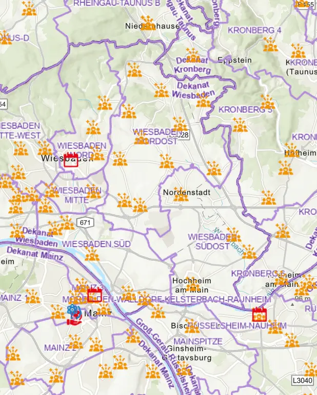 In unserem Referat stellen wir Ihnen eine Vielzahl von Karten bereit. Sie können zwischen verschiedenen Printkarten wählen, die wir jährlich auf den aktuellsten Stand bringen. Außerdem stellen wir Ihnen interaktive Geo-Informationssysteme der EKHN zur Verfügung (Portale), die Sie zusätzlich mit weiteren Informationen bedienen.
